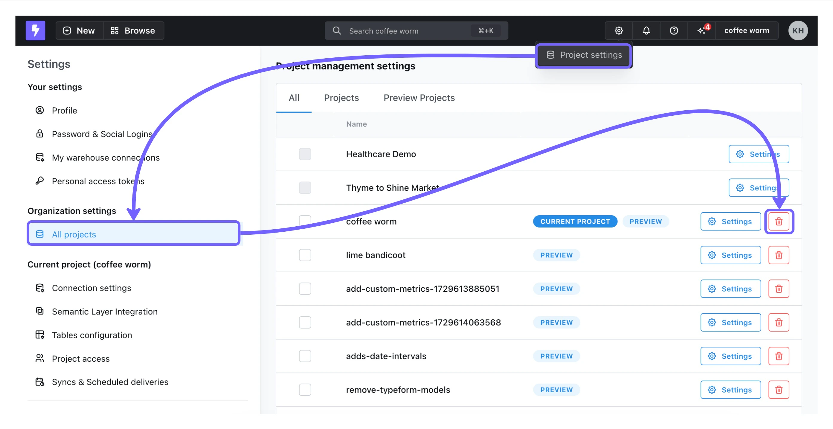 Preview projects created using any method can be deleted in the Lightdash App. There are also other more automated ways of deleting preview projects created in the Lightdash CLI and in GitHub Actions explained below.Lightdash CLI Tool (Local)