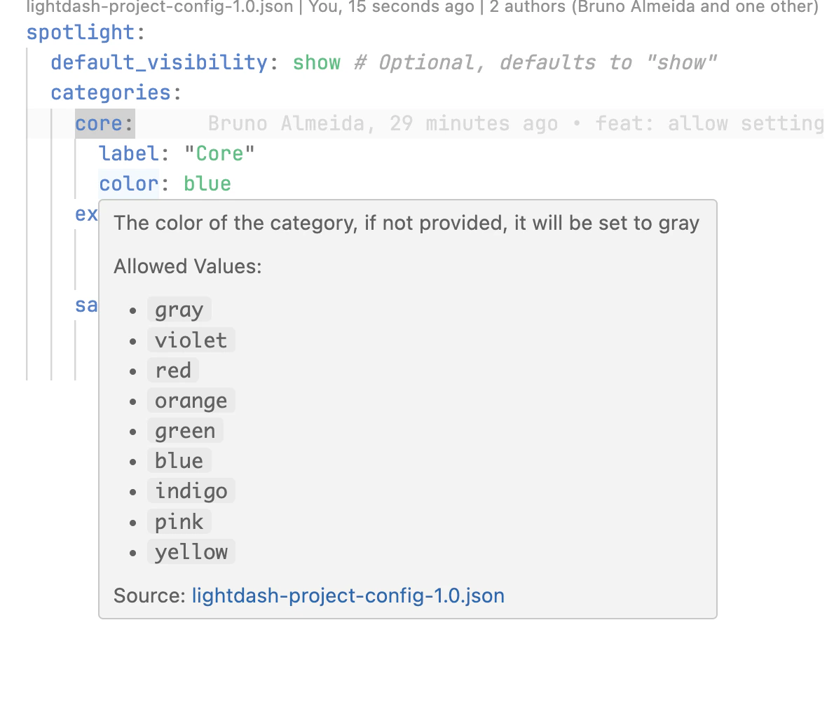 If you want to add another category to a specific metric, you can do so by adding the categories field to the metric’s .yml file. And remember, you can only add categories that have been defined in the lightdash.config.yml file.