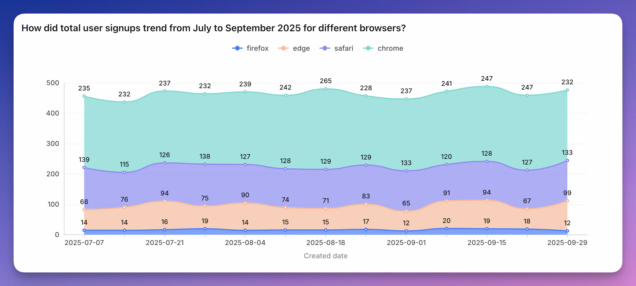 - you’re showing multiple series over time. If you just want to show one value over time, also consider a line chart instead; especially if you don’t want your y-axis to start at zero. If you only have a few dates, you can also consider using a column chart. In both cases, labelling will be better.
